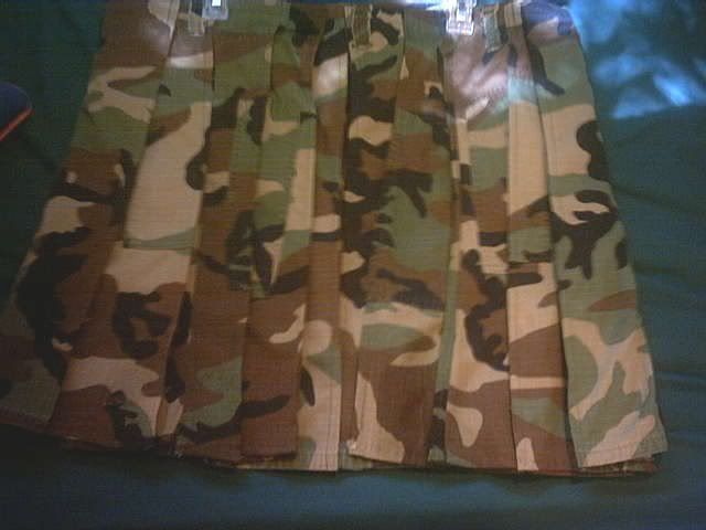 The fabric is the camo from a couple of "COAT, UTILITY, MATERNITY"'s. I love this idea for recycling. The way that it is stitched together gives it an uneven Frankenstein feel that is charming in its haphazardry and makes each garment unique. It has nice swish. The light weight of the fabric means that it is less to carry around which makes it more comfortable. Overall I recommend a GrodyGoose kilt as a kilt to kick around the house in and wear to very casual occasions. If you're going to live the kilted life, you'll need a kilt like this.