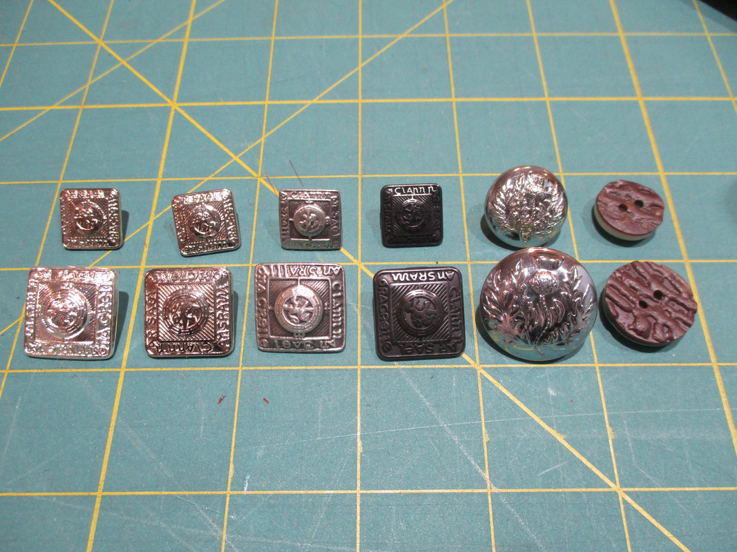 I am in the process of changing out the garish chrome diamond shaped buttons on my Argyle jacket and vest with round knotwork pewter buttons from JoAnn's fabrics.