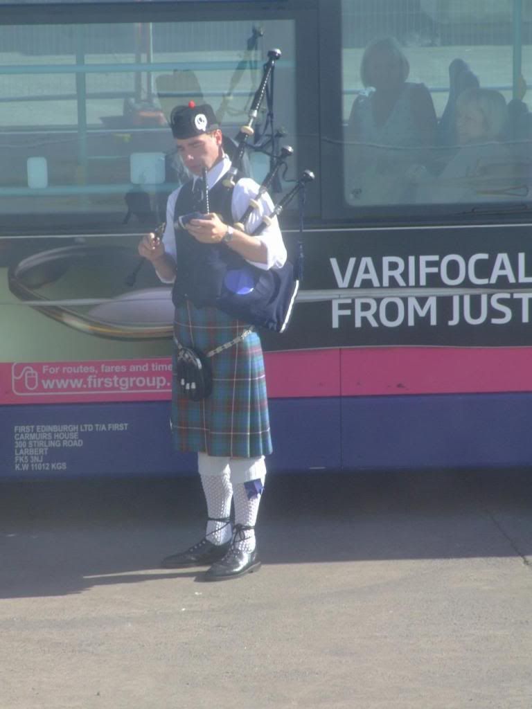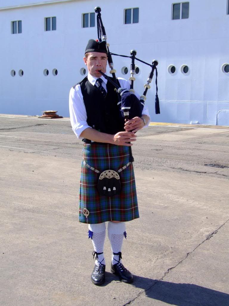 At last! He's piping! Think he was surprised to see some one disembark in a kilt though!