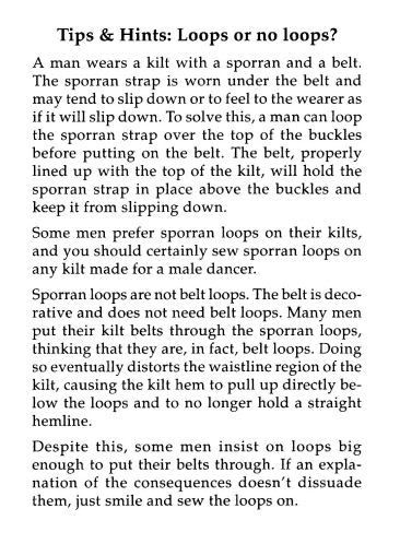 When you put the belt on remember, it DOES NOT go thru the beltloops on the back of the kilt. Those are there to hold the sporran strap. They are long so the sporran strap is below the kilt belt and not underneath it.