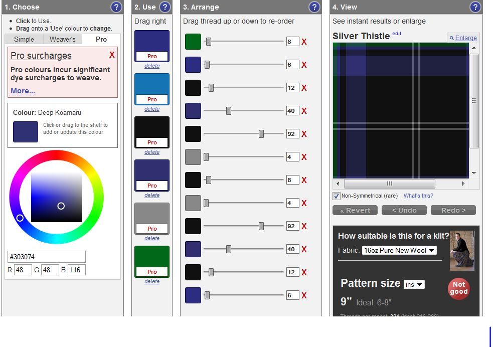Incidentally, I did not mention in my previous postings that if you bring up Scotweb's Tartan designer, access the Silver Thistle, and choose Modify, it will appear differently depending on whether you select "Convert to Weaver's Colours" or "Use the Pro Colours". That, of course, is not surprising in itself, but in the former case the blue looks blue, but the oxford looks purple. In the latter both the blue and oxford appear as purple!